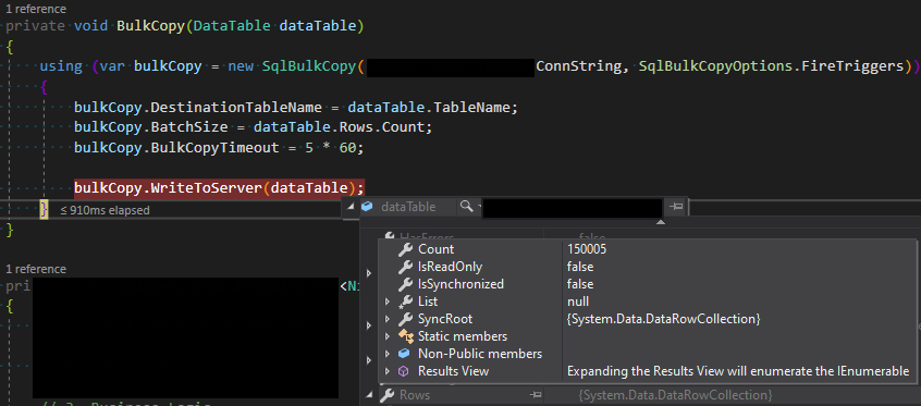 dataTable 변수에 입력된 15만 5건의 row를 insert 하는데 910ms가 걸렸다.
