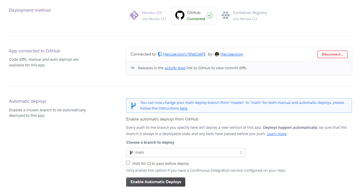 물론 아래와 같이 Heroku에서 Automatic Deploys를 설정해도 된다.