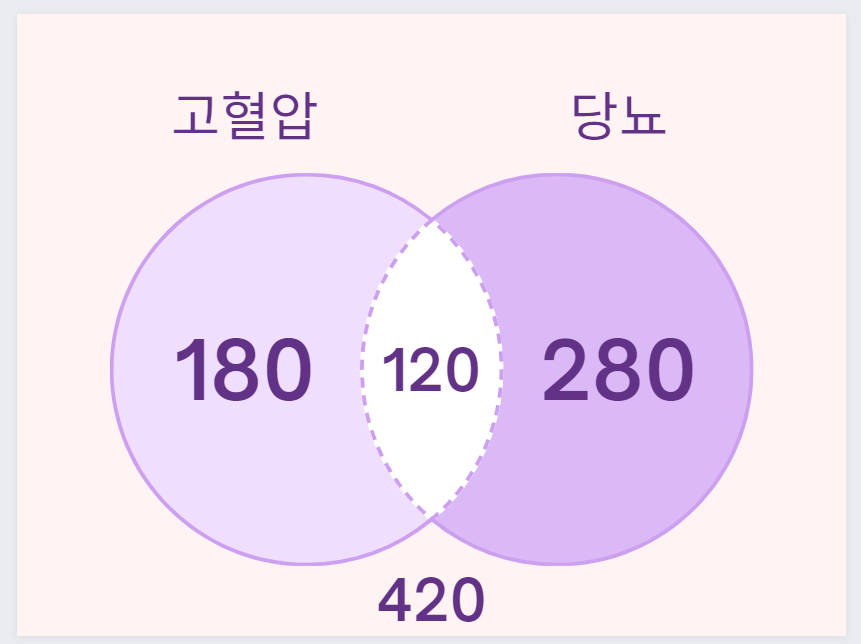 - 고혈압, 당뇨는 독립적이라고 가정해서 당뇨 환자 400명 중 30%(120명)이 고혈압까지 동시에 앓는다.