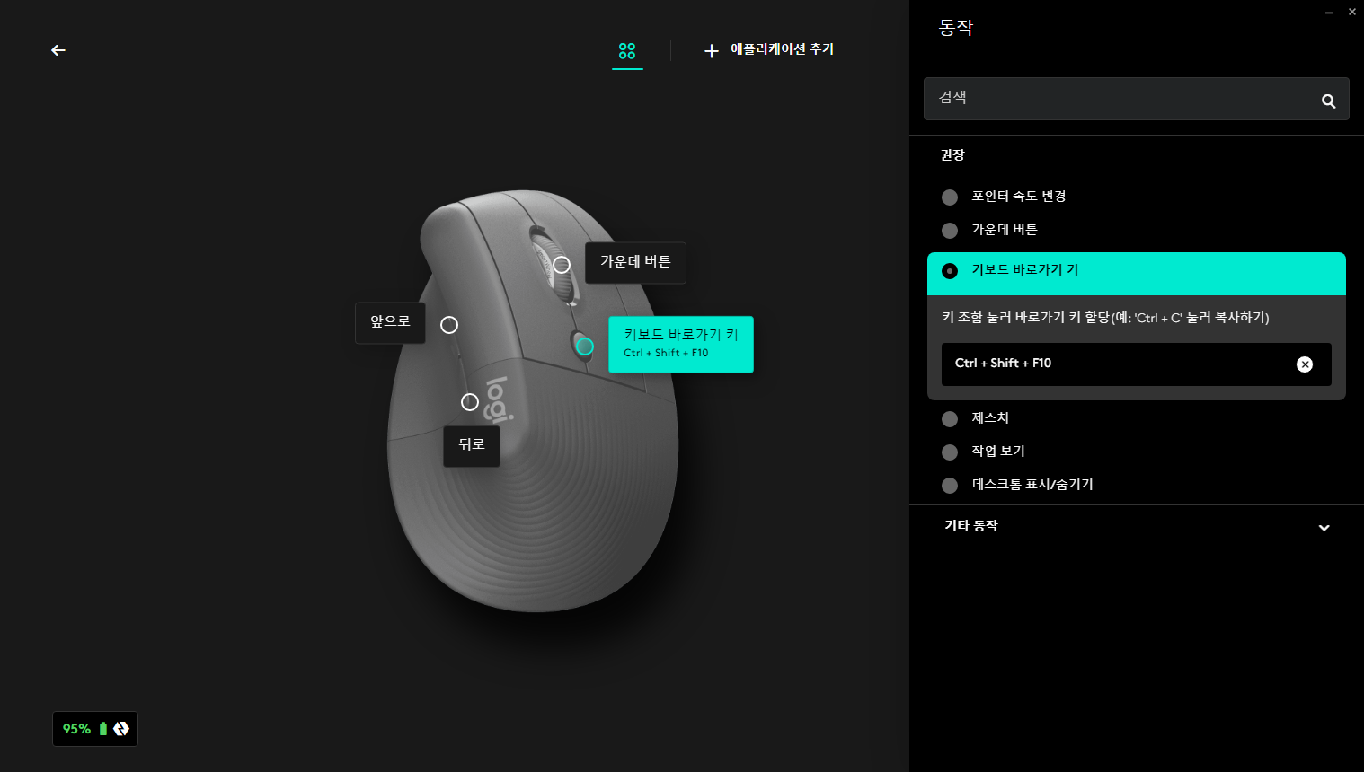오른쪽 [동작 > 권장] 탭에서 [키보드 바로가기 키]를 선택하면 되는 거였다.