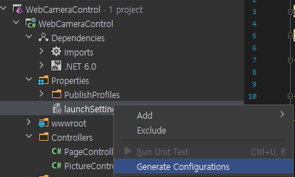 Explorer 메뉴에서 lauchSettings.json 파일을 찾아서 아래 메뉴를 클릭하면 된다.