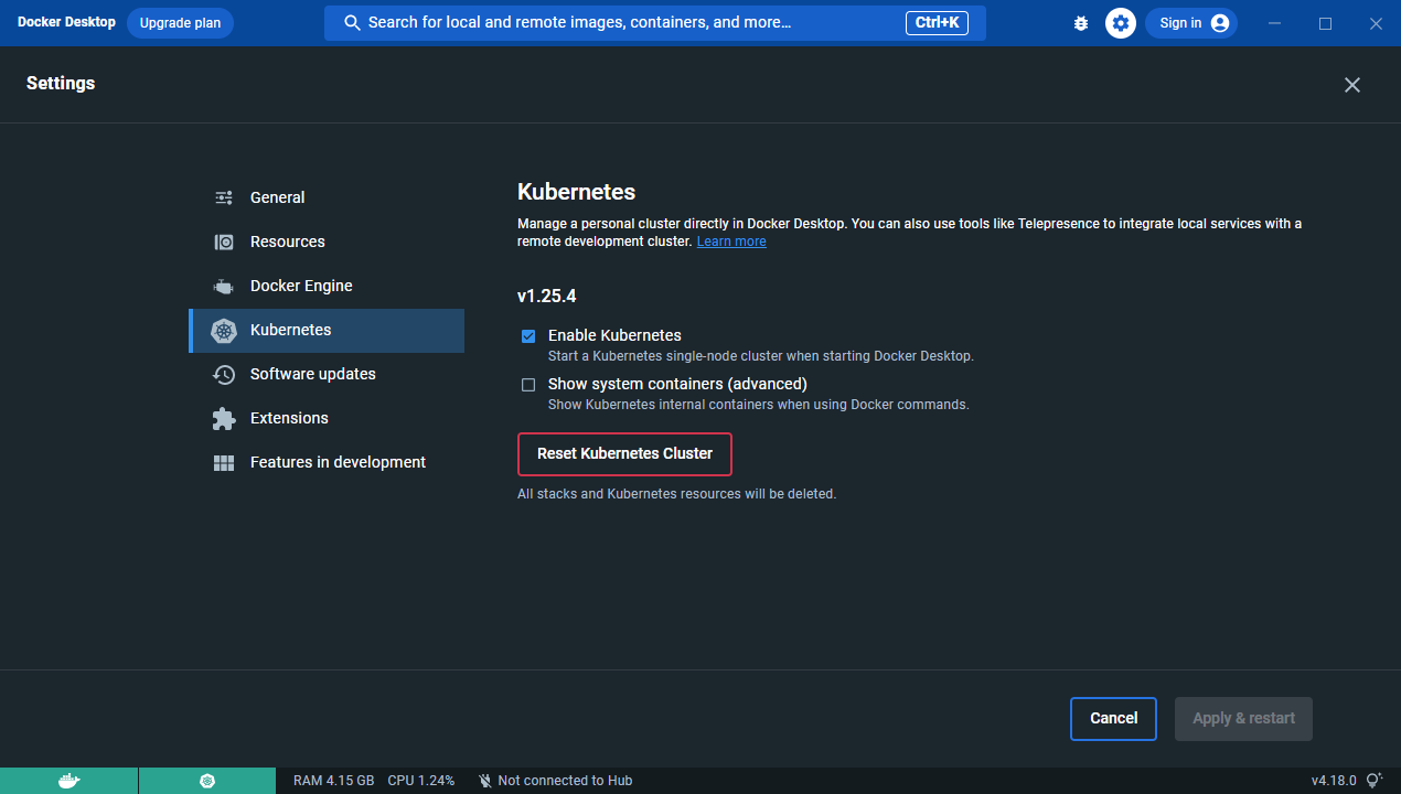 아래에서 보이는 Reset Kubernetes Cluster 기능이 Cluster를 초기화해 주기 때문에 이것저것 만들어보고 초기화하며 연습하기 좋은 것 같다.