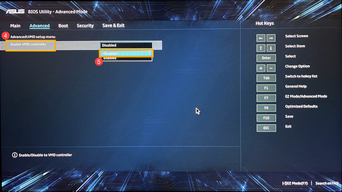 볼륨 관리 장치(VMD) 기술을 비활성화하여 해결했다.