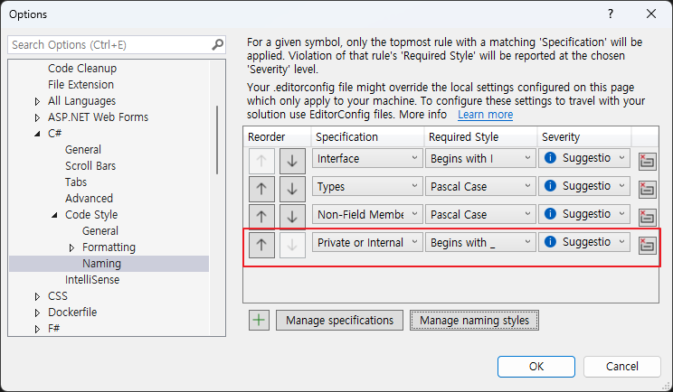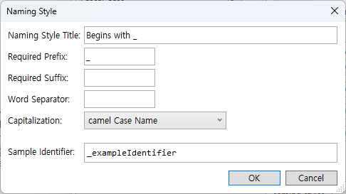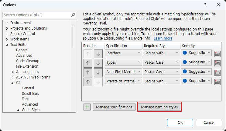 1. Options > Text Editor > C# > Naming 탭으로 이동해서 아래 manage naming styles 버튼을 누른다.