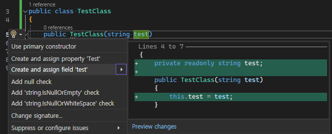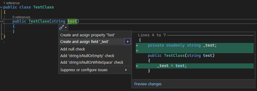 VS 2022에서 Create and assign field '...' 기능을 통해 만들면 다음과 같은 preview가 보인다.