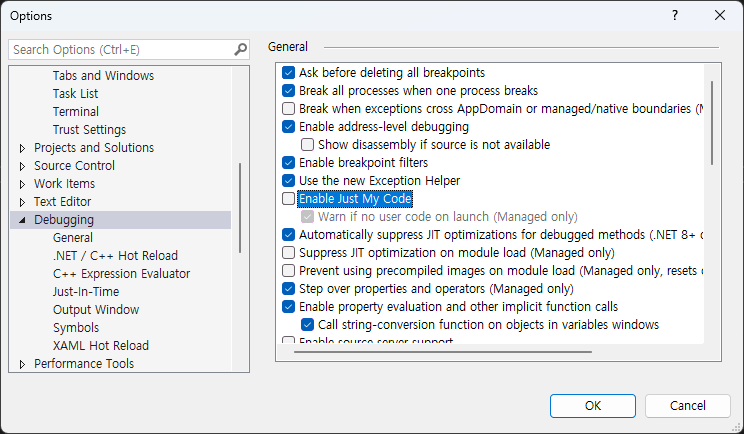 아래 Debugging 메뉴를 선택하고 Enable Just My Code를 체크 해제한다.