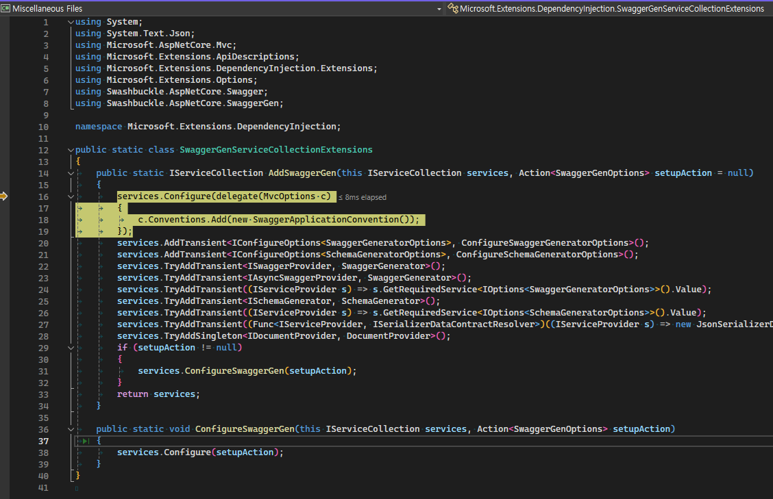 아래 링크에서 Swashbuckle.AspNetCore package의 실제 소스코드와 동일한 것을 확인할 수 있다.