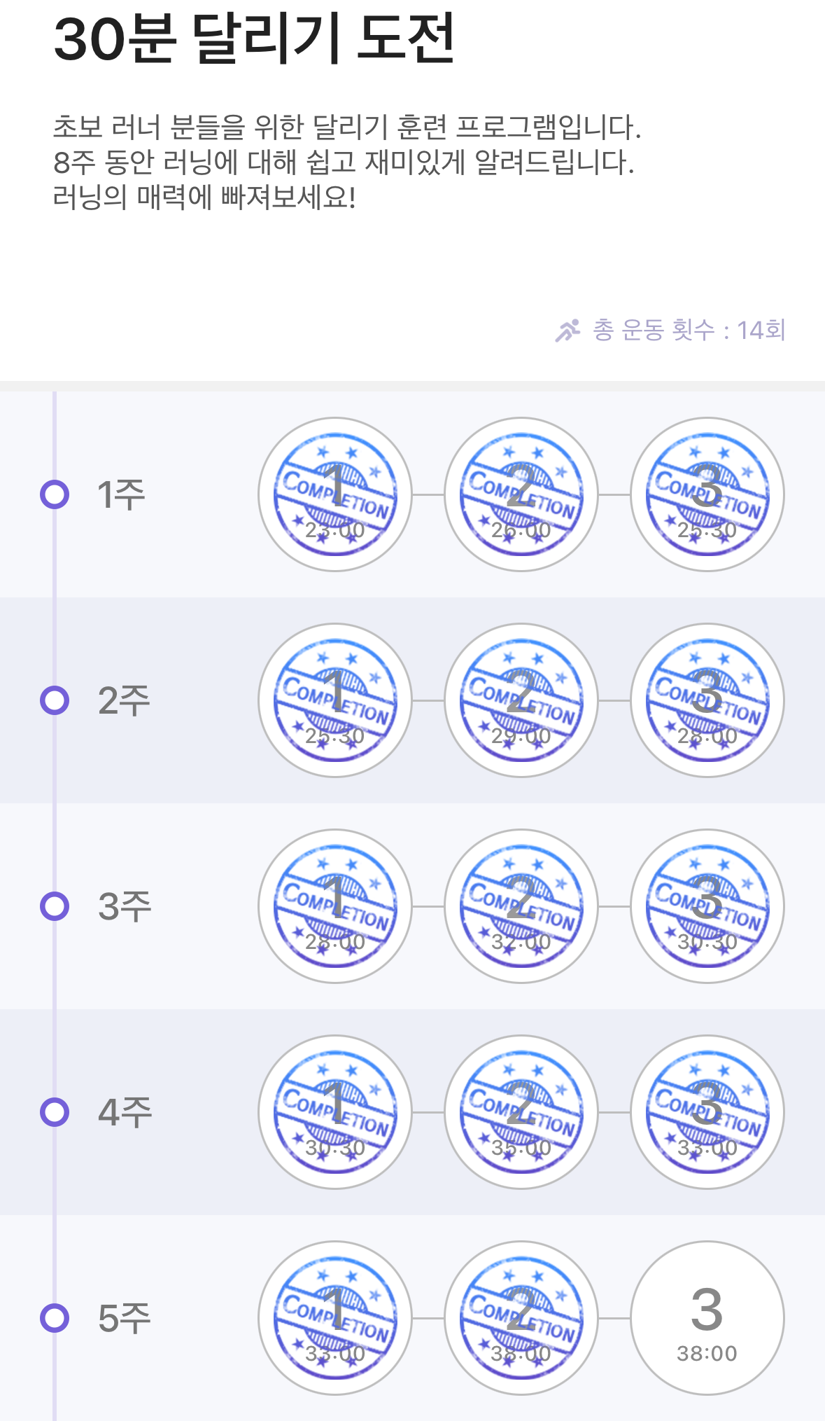 1주차는 (1분 달리기 + 2분 걷기) * 5회 반복으로 시작해서 점차 달리기 시간이 늘어나는 교육과정이었다.