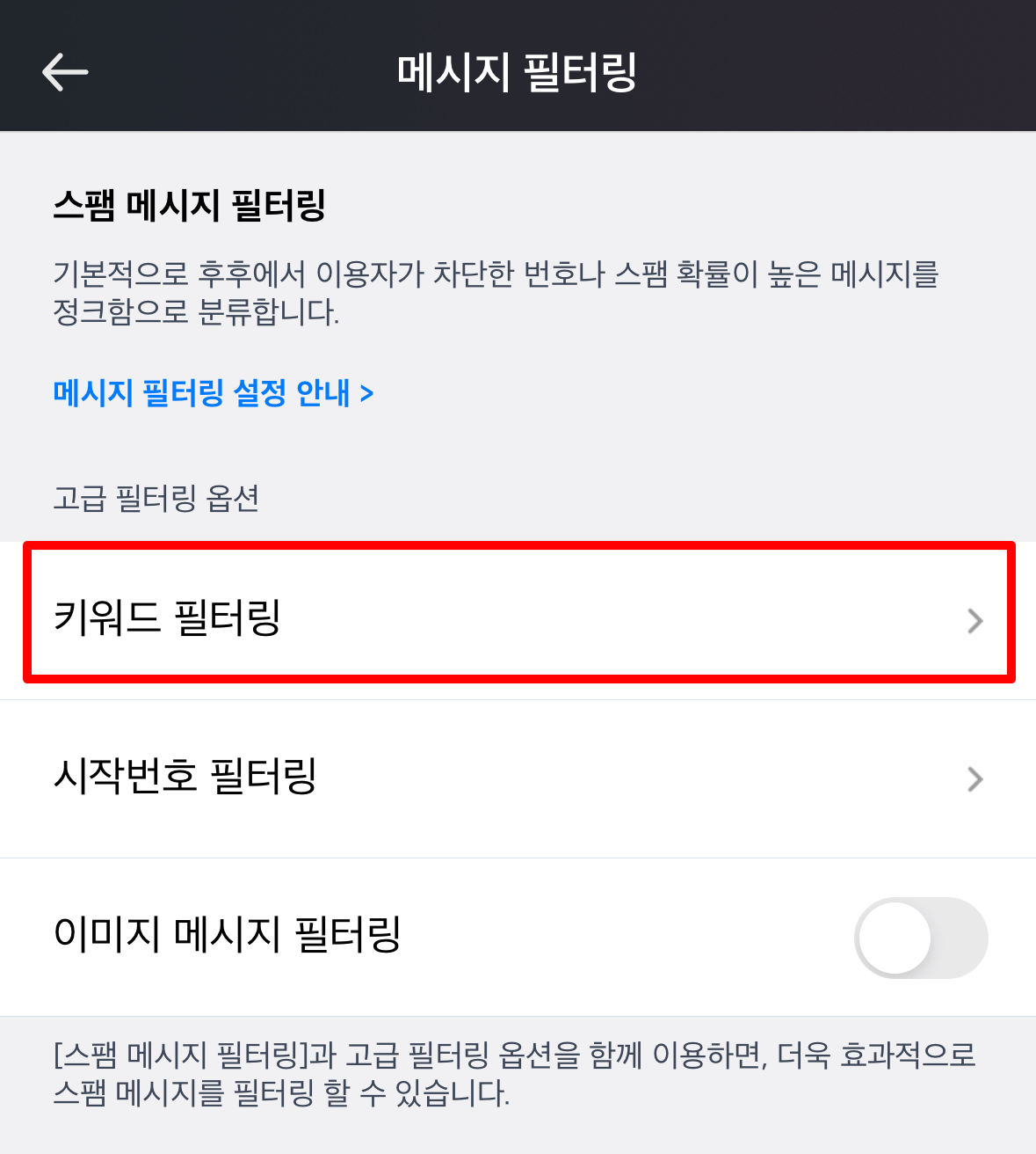 먼저 앱을 시작한 다음 더보기 탭으로 이동 후 메시지 필터링을 클릭한다.