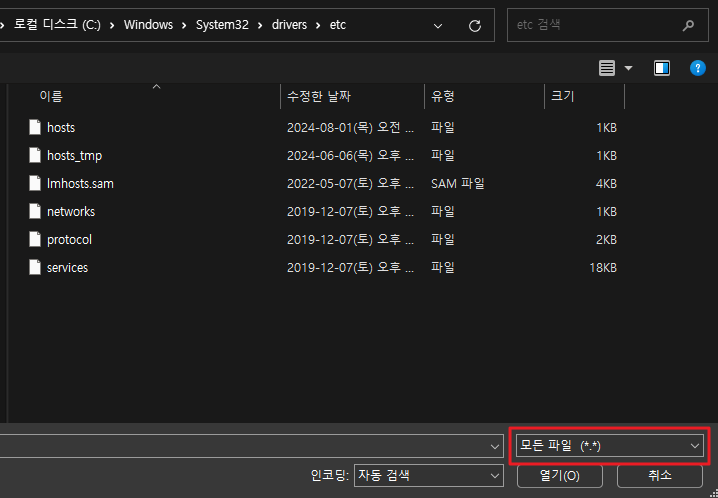 3. 아래 경로로 이동 후 오른쪽 아래 빨간 상자 부분을 모든 파일로 변경 후 열기