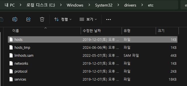 2. 해당 경로에 있는 hosts 파일을 텍스트 편집기로 관리자 권한으로 연다.