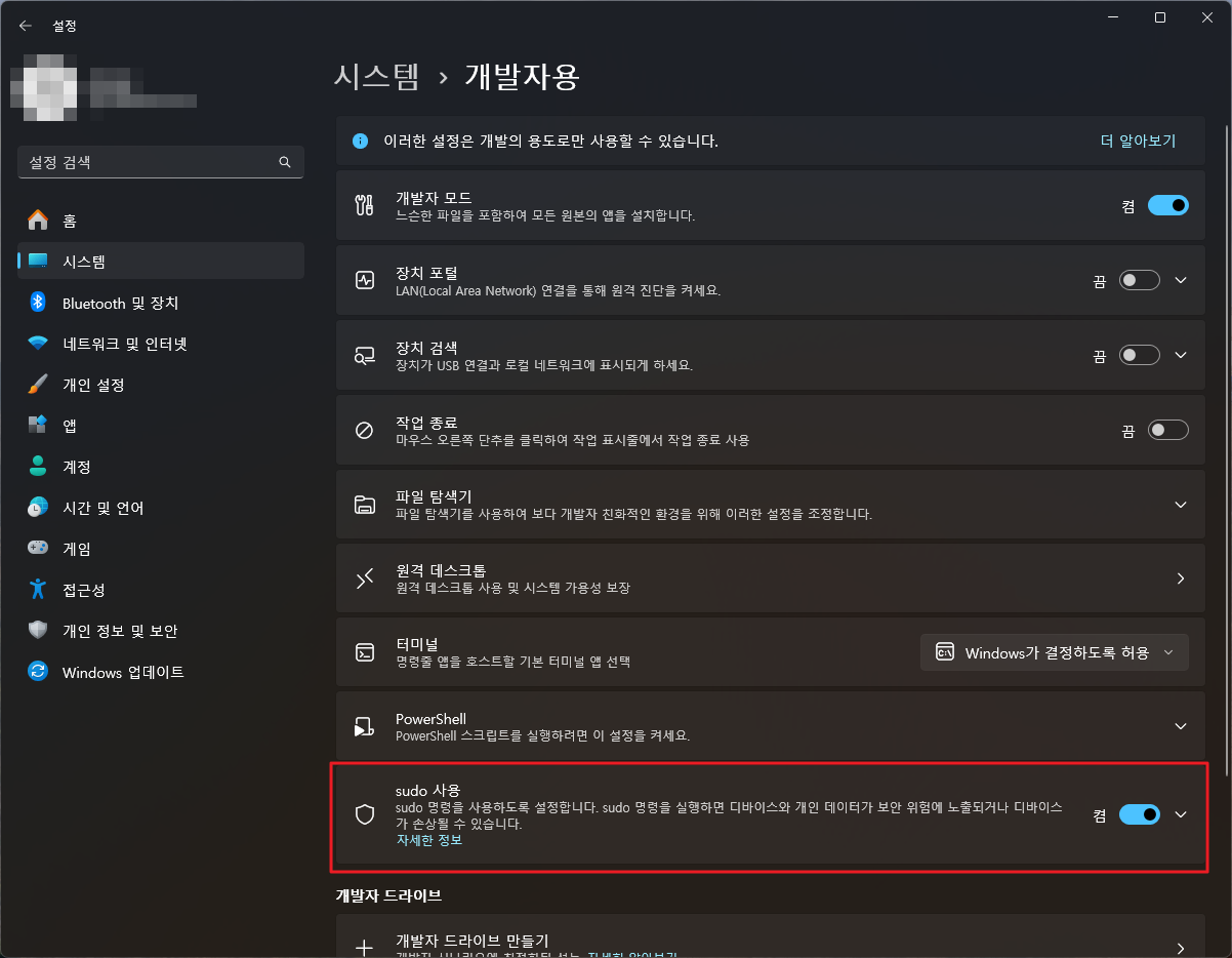 Windows 설정 > 시스템 > 개발자용에서 sudo 사용을 켬으로 변경한다.