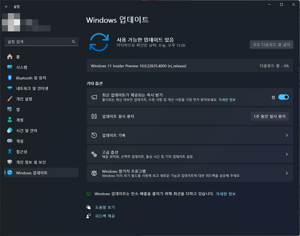 다시 Windows 설정 > Windows 업데이트로 돌아가서 최신 업데이트가 제공되는 즉시 받기를 켬으로 변경한다.