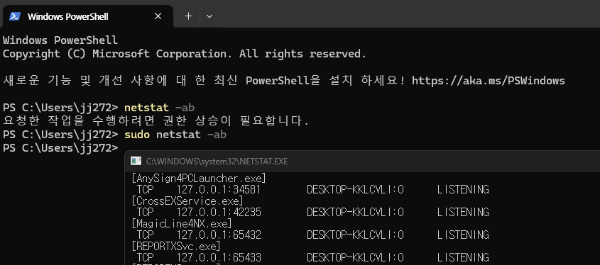 처음 sudo 없이 실행했을 때 명령어를 실행했을 때 권한이 필요하다는 메시지가 표시 됐지만