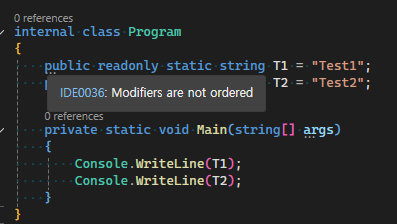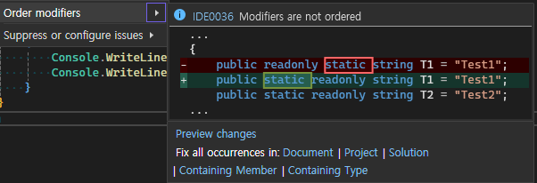 그러고 다시 소스코드로 돌아가보면 잘못된 순서인 readonly static의 경우 IDE0036 에러가 발생하게 된다.