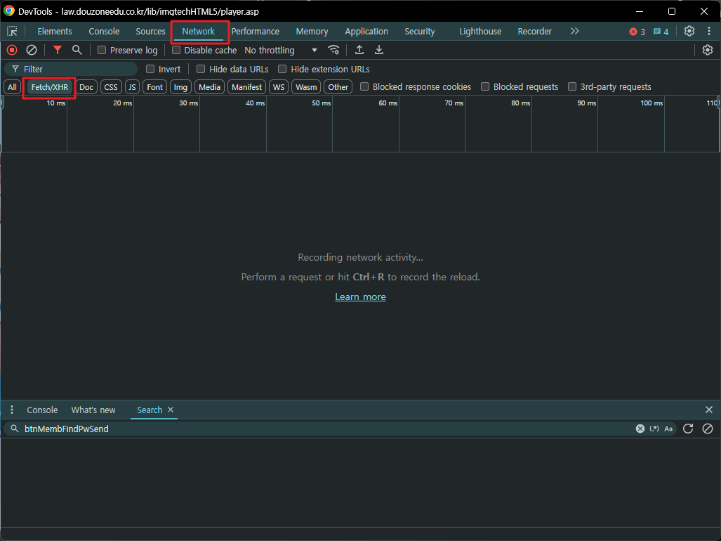 2. 개발자 도구에서 Network 탭으로 이동한다. Fetch/XHR 버튼을 클릭해서 필터를 건다.