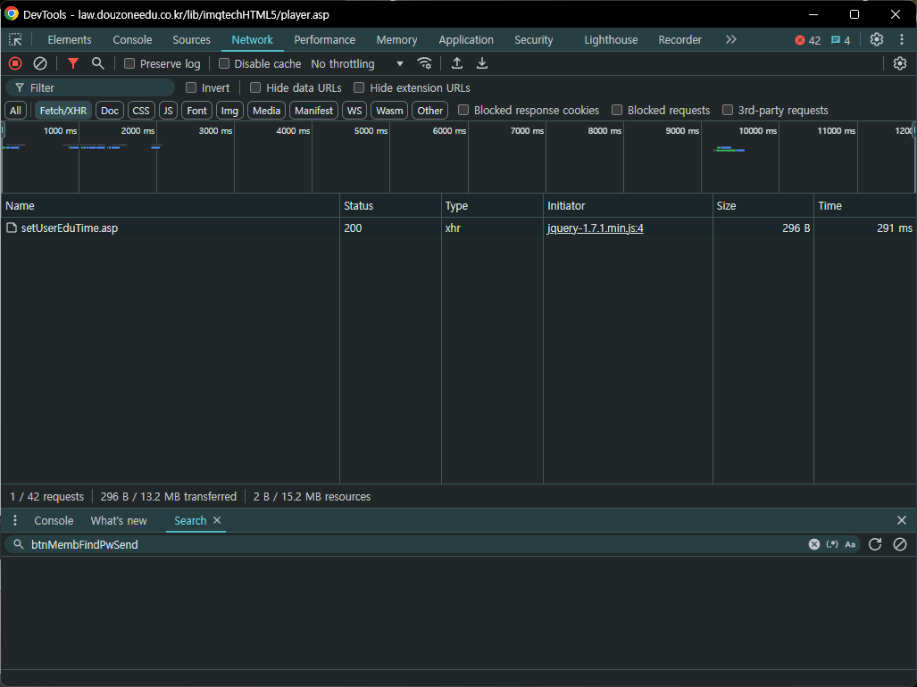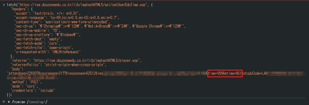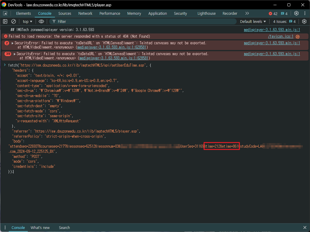 3. 동영상의 재생바를 끝까지 옮긴다. 그러면 setUserEduTime 요청이 보인다.