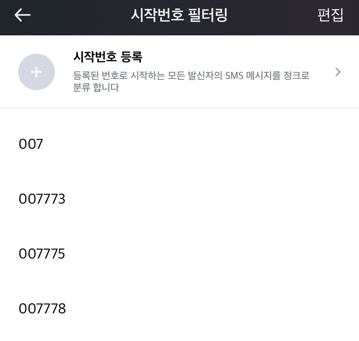 아예 007로 시작하는 모든 문자를 차단하려고 후후앱에서 시작번호 필터링을 설정했다.