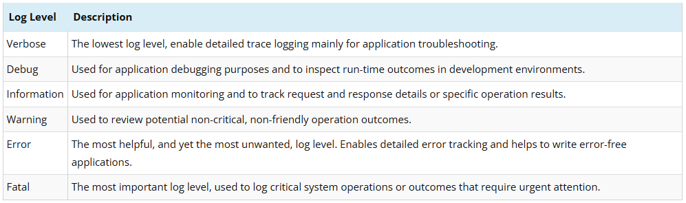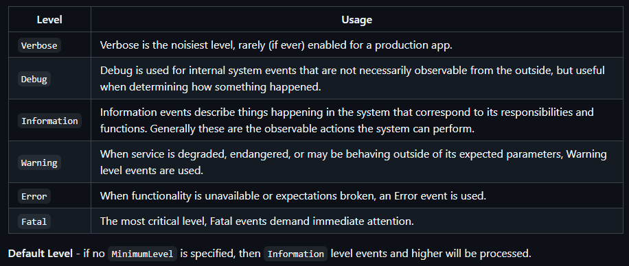 Serilog로 로깅을 하고 있는데 가끔 어떤 level로 로그를 남겨야 할지 헷갈릴 때가 있다.