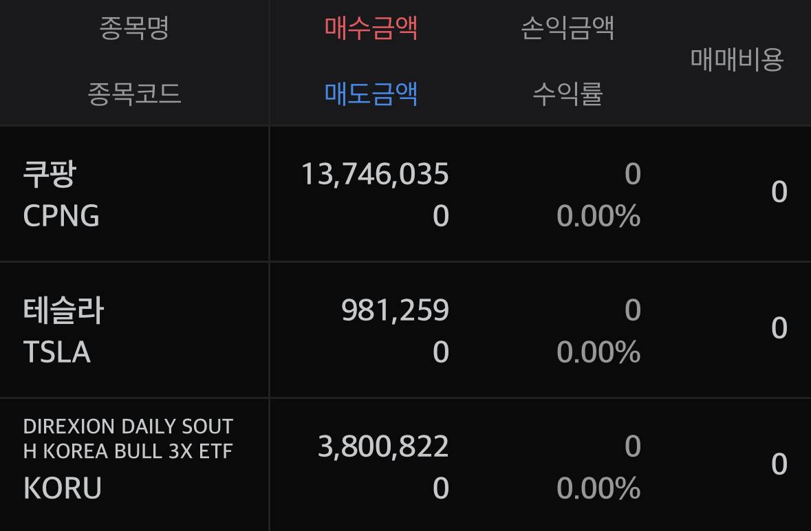 우리나라 주식이지만 나스닥에 상장되어 거래가 가능했던 쿠팡을 매수했고 KORU ETF도 매수했다.