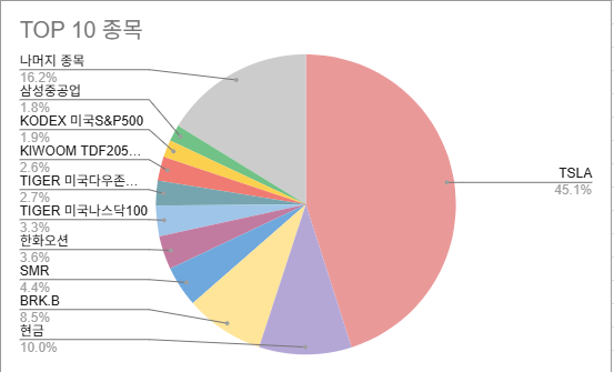 조선주가 많이 오르면서 테슬라의 비율이 49%에서 45%로 줄었다.